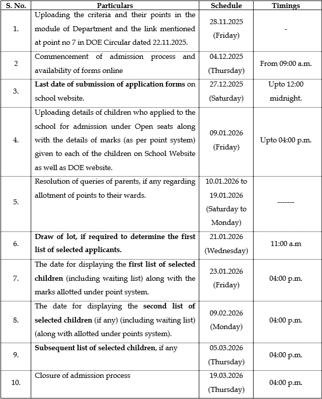 The online registration process for admission in  Nursery (Bal Vatika 1/ Pre-School 1) –Session 2026-27 will commence w.e.f 04.12.2025 and last date of submission of registration Form is 27.12.2025. The seat availability, admission criteria, admission schedule and fee structure will be as per details  below: